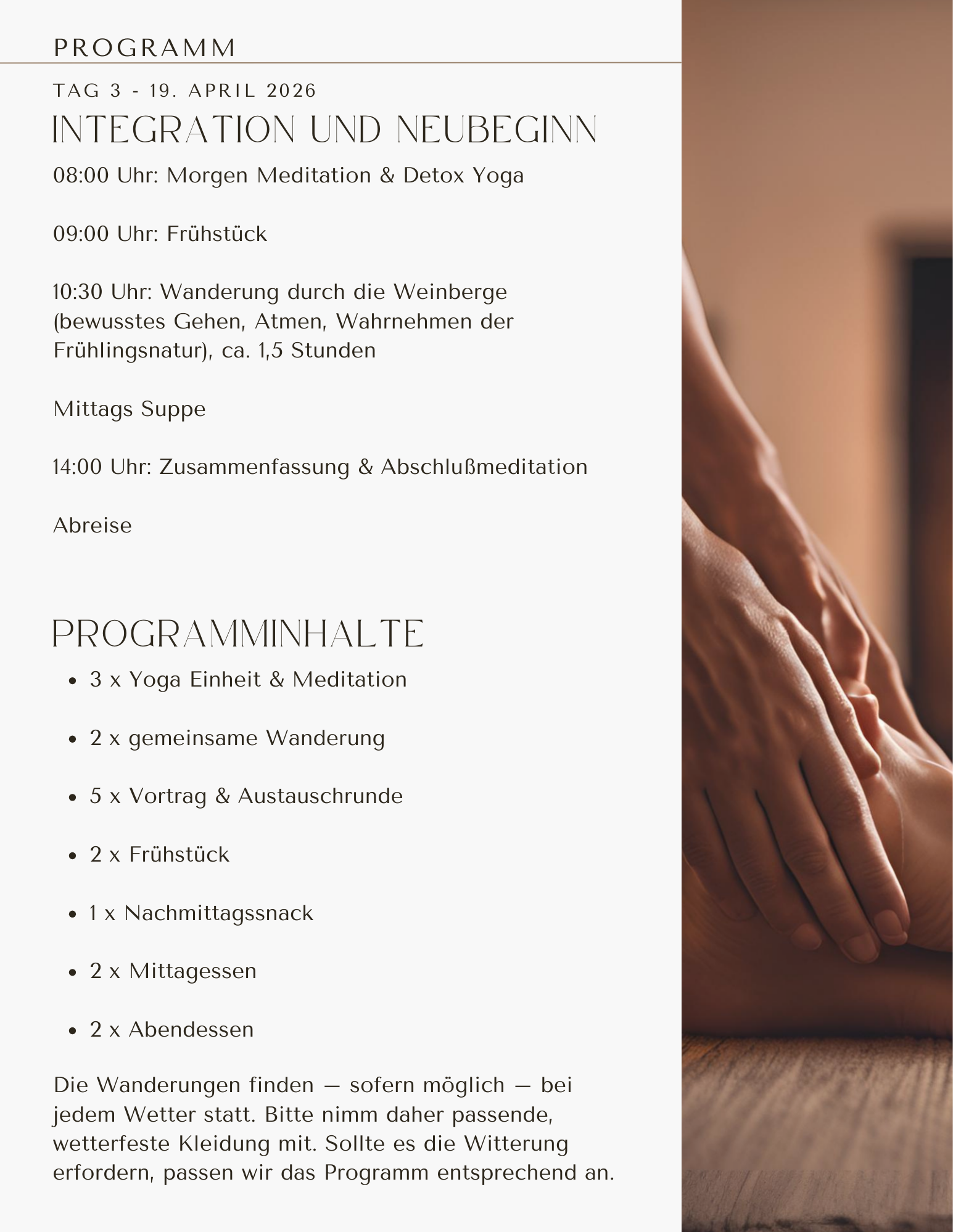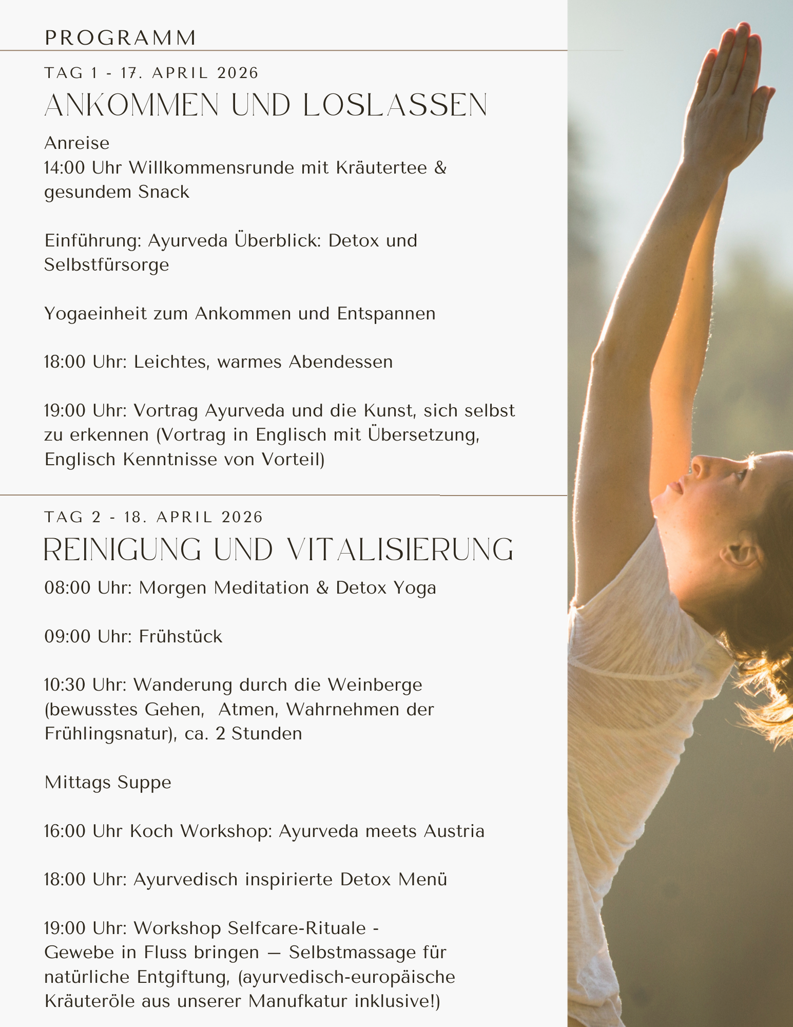 Während dieser vier Tage tauchst du tief in die Welt des Detox ein: achtsame Yogaeinheiten, wohltuende ayurvedische Impulse und bewusste Rituale unterstützen dich dabei, Ballast loszulassen und neue Energie zu schöpfen. Du lernst, wie Selbstfürsorge tatsächlich gelebt wird – nicht als ein Todo auf deiner Liste, sondern als liebevolle Haltung dir selbst gegenüber. Denn erst wenn Selbstfürsorge selbstverständlich wird, kann daraus echte Selbstliebe entstehen.