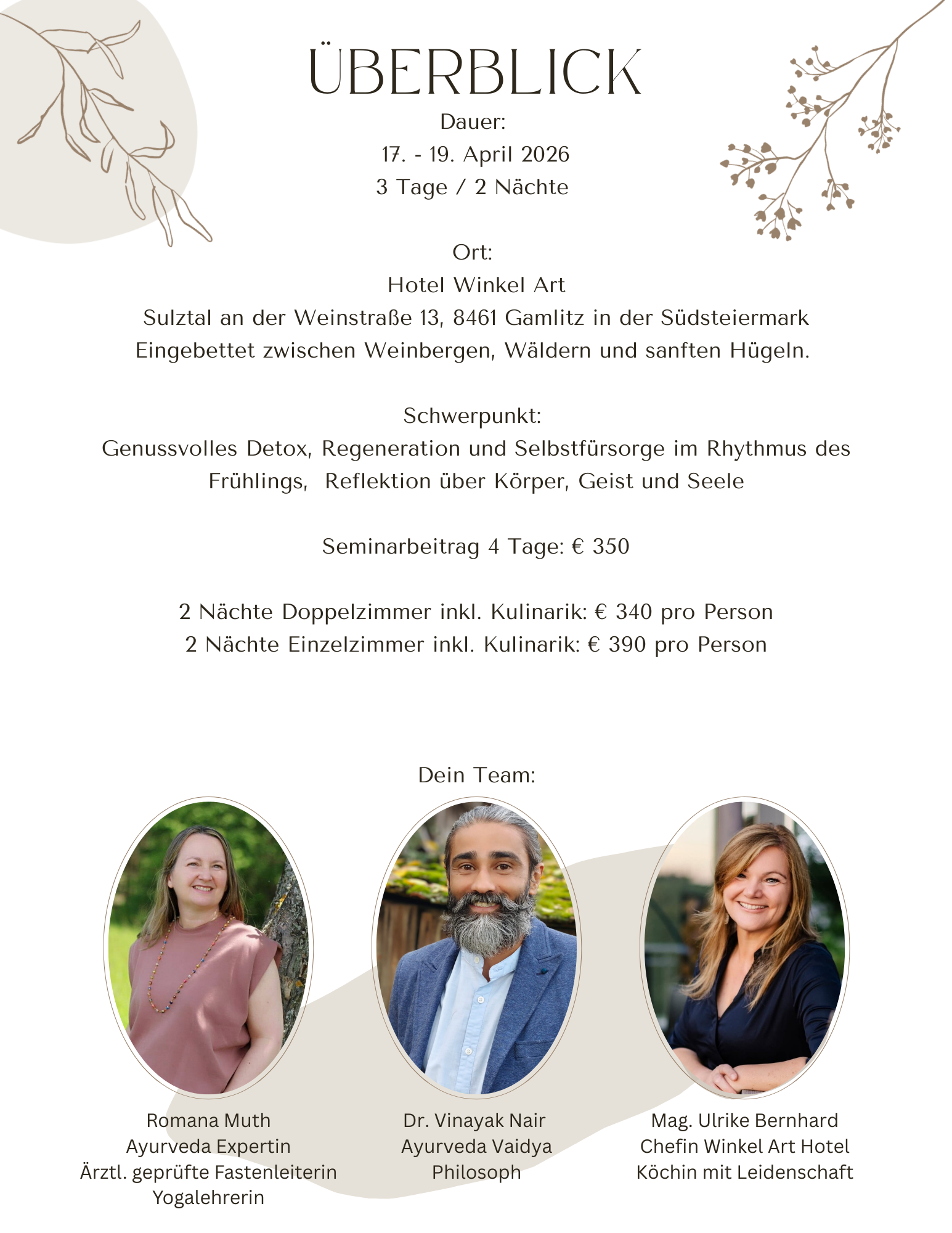 Gönn dir eine Auszeit, die Körper, Geist und Seele gleichermaßen berührt. In der idyllischen Südsteiermark, umgeben von sanften Hügeln, Weinbergen und der besonderen Atmosphäre des Winkel Art Hotels, erlebst du ein Retreat, das die zeitlosen Weisheiten des Ayurveda mit westlichem Wissen und modernem Lebensstil verbindet.