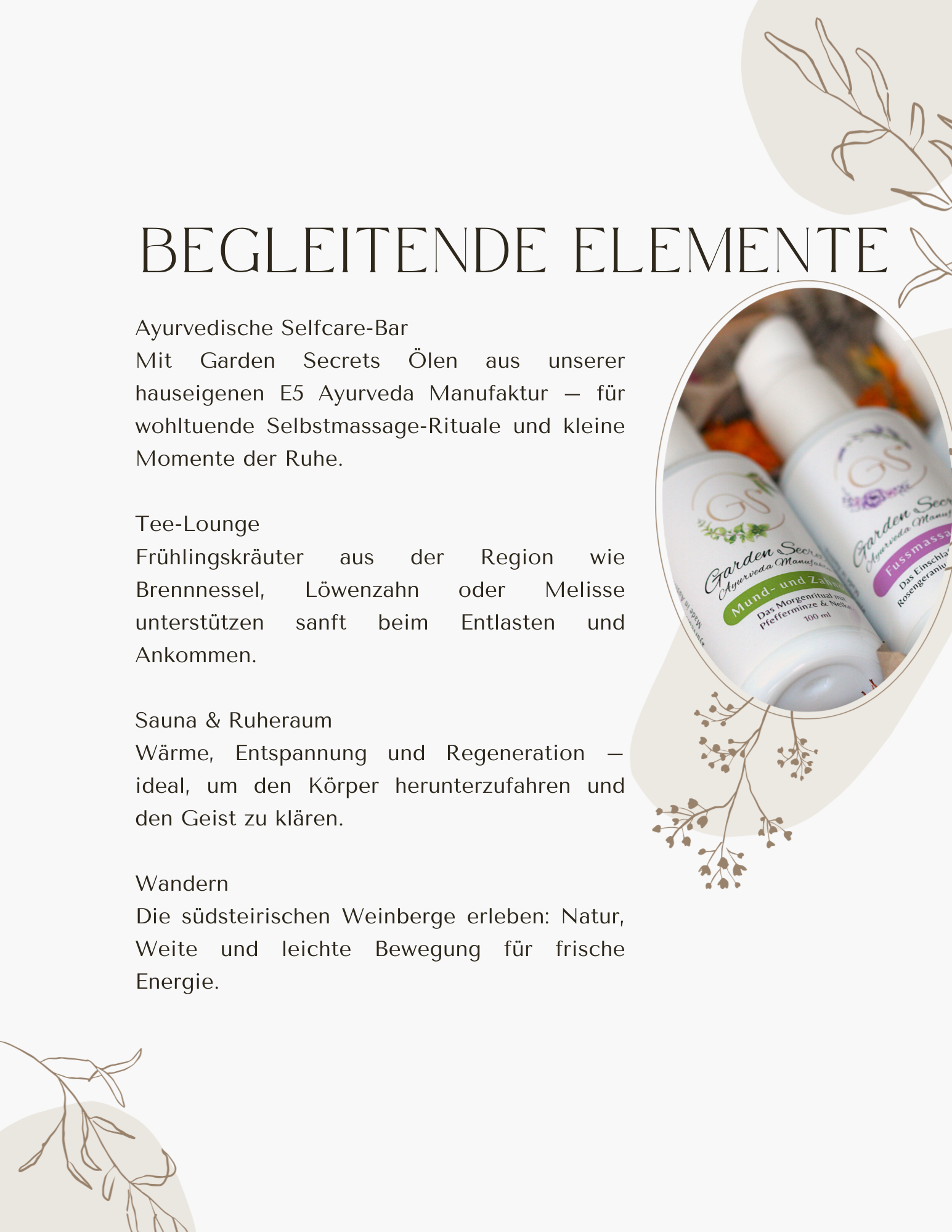 Dieses Retreat ist eine Einladung, wieder bei dir anzukommen, Klarheit zu finden und deinem Körper jene Aufmerksamkeit zu schenken, die er verdient. Ganz im Sinne des Ayurveda: sanft, wirkungsvoll und tiefgreifend.